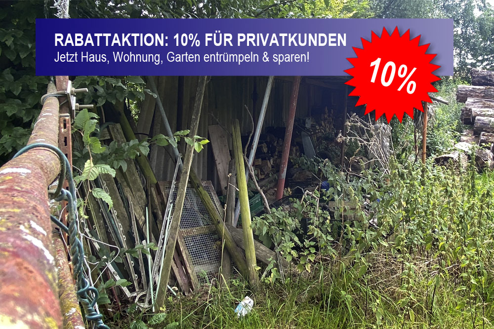 Passend zum Frühling bieten wir Ihnen bist zum 30. April 2026 nicht nur auf jede Haus- und Wohnungsentrümpelung 10 % Rabatt, sondern auch auf Gartenräumungen! So haben Sie endlich wieder genügend Platz, um Ihren Garten Ihren Vorstellungen entsprechend zu gestalten: